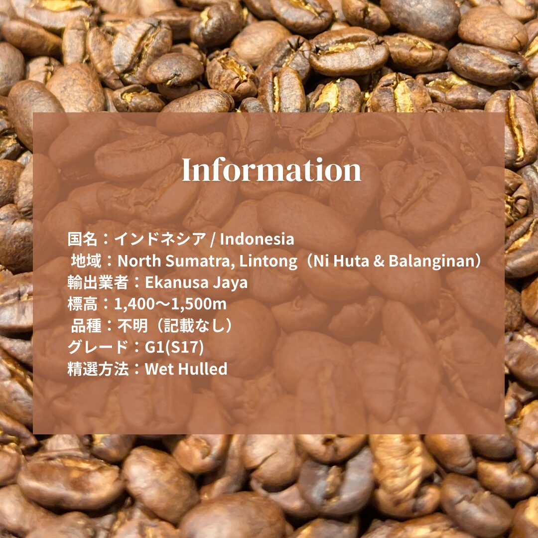 深煎りで感じられる苦味よりも、発酵由来の個性的な酸味と甘さが際立ち、「スマトラ式(Wet Hulled)」による独特な風味を存分に楽しむことができます。